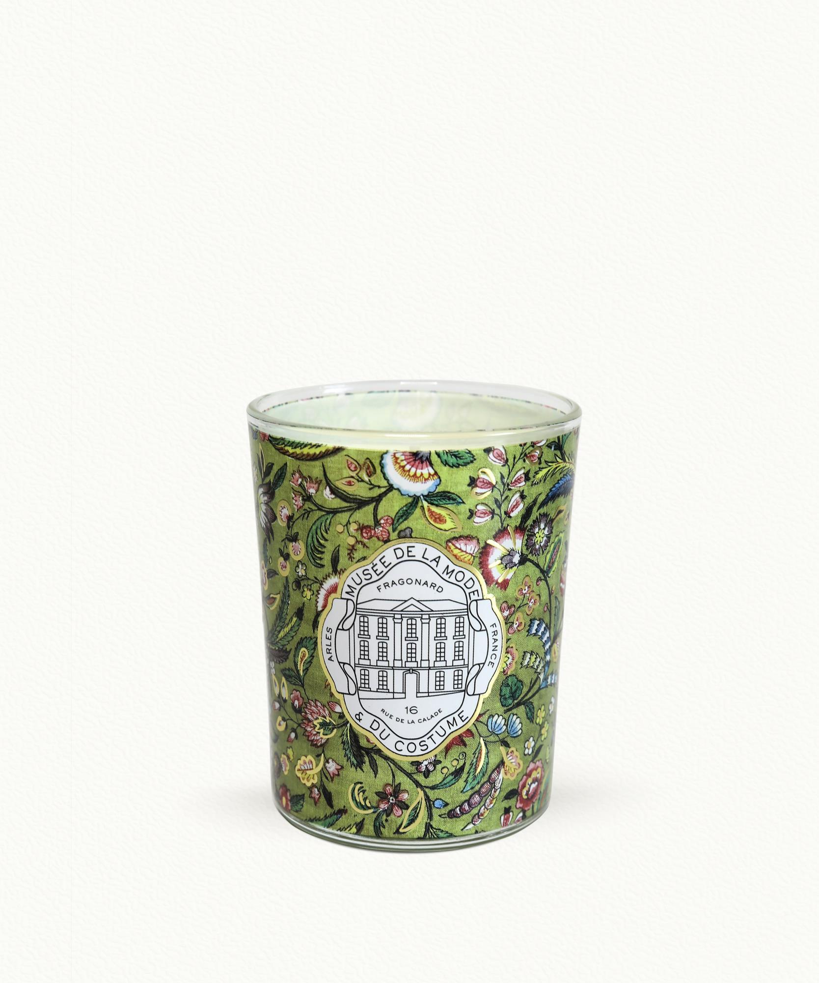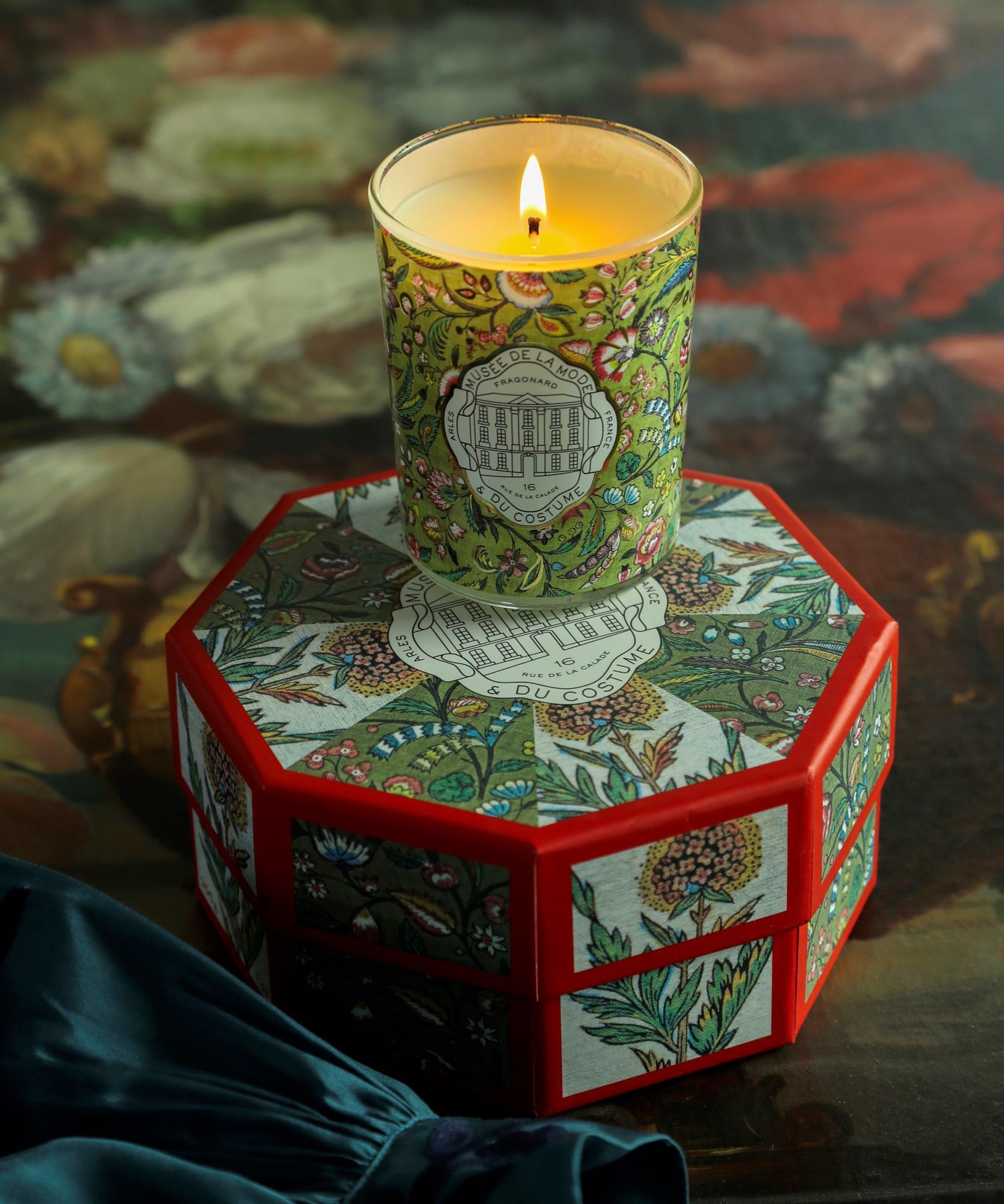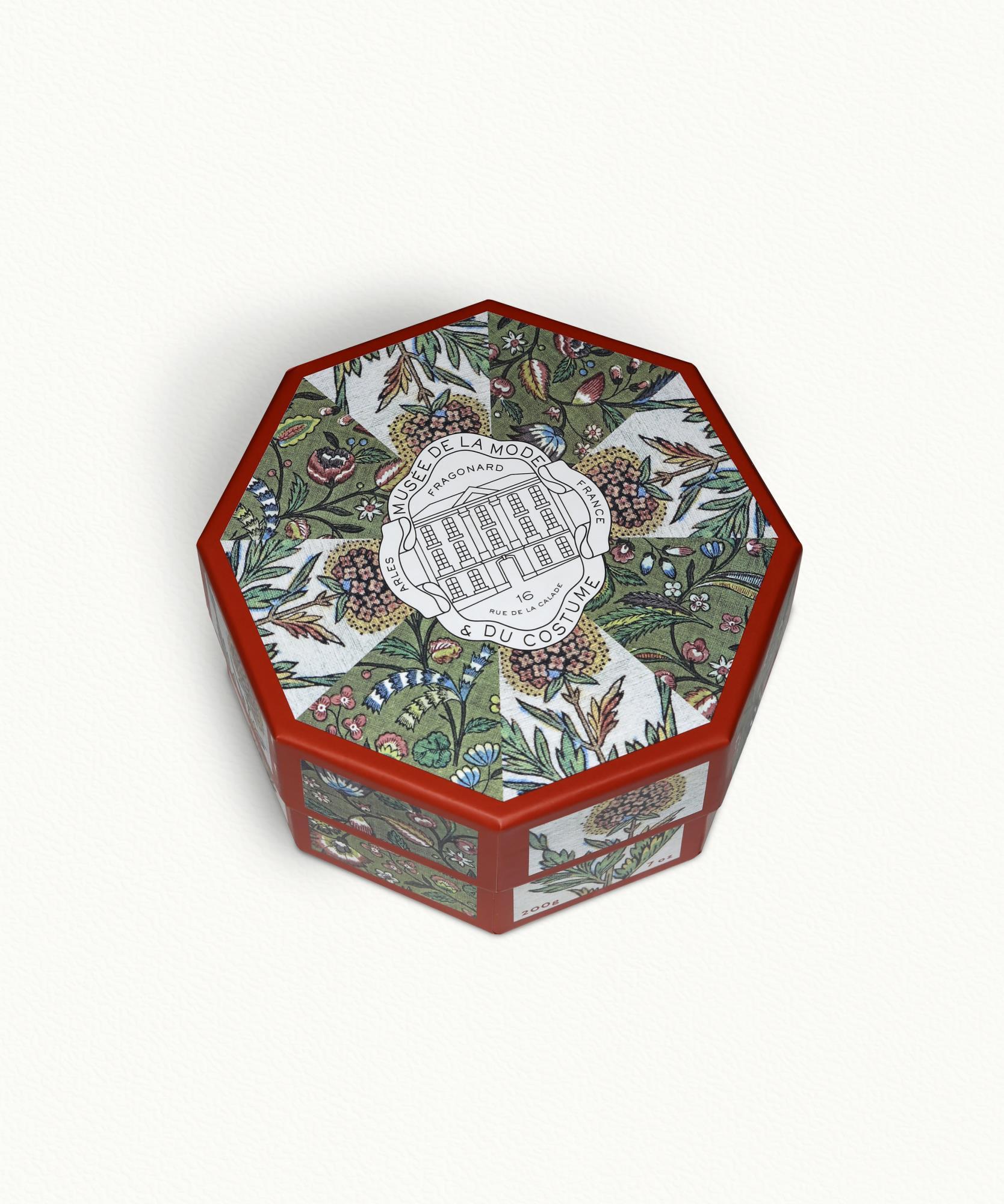 Украшенная провансальскими мотивами из наших текстильных коллекций, свеча из Музея Моды и костюмов Фрагонара представлена в восьмиугольном футляре, созданном по образцу старинной пудреницы.